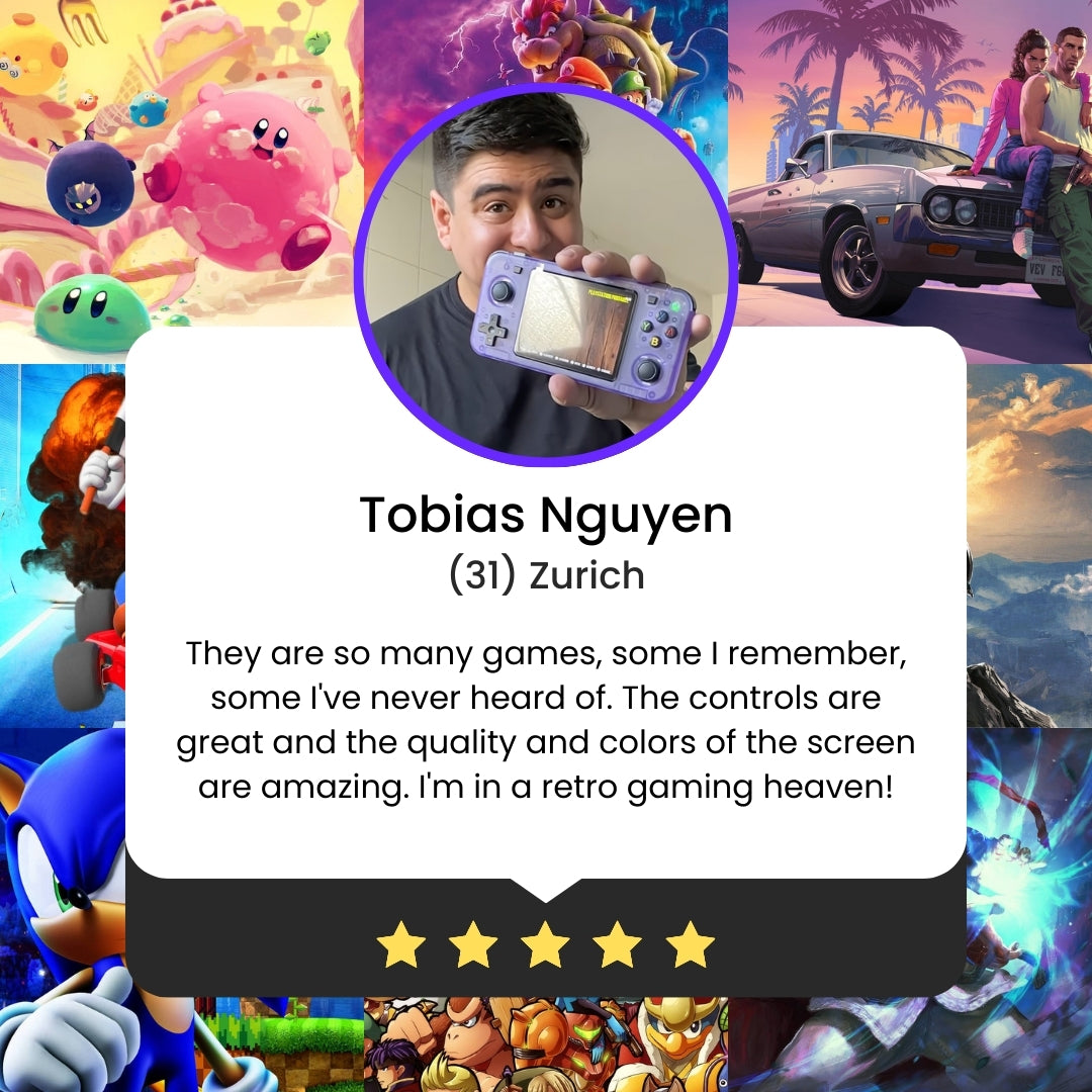 The ConsoleChronicles™ Portable Advanced boasts an extensive collection of classic, retro, and modern games. From Mario Kart, Dragon Ball, Sonic, Grand Theft Auto, Pokémon, Tekken to Mortal Kombat - and many, many more!